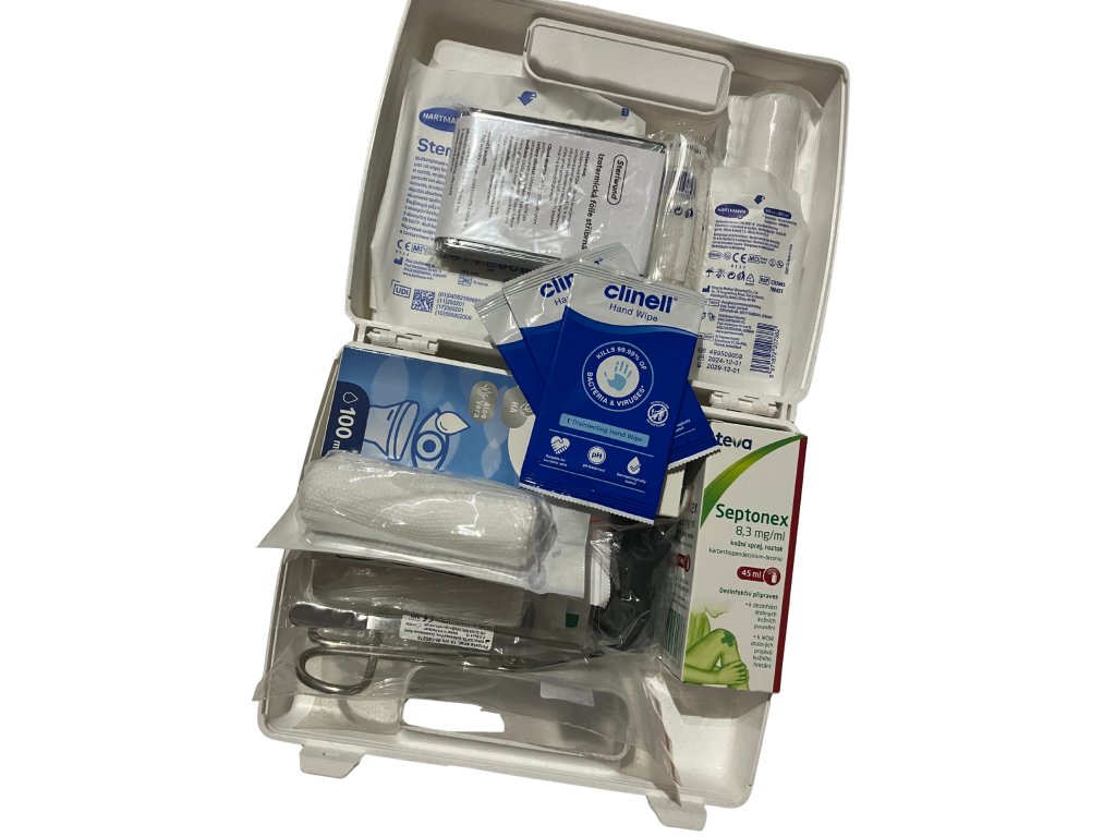 Lékárnička v bílém plastovém kufříku obsahuje zdravotnický materiál pro 5 osob a je vhodná především pro domácnosti či menší pracoviště a kanceláře.
